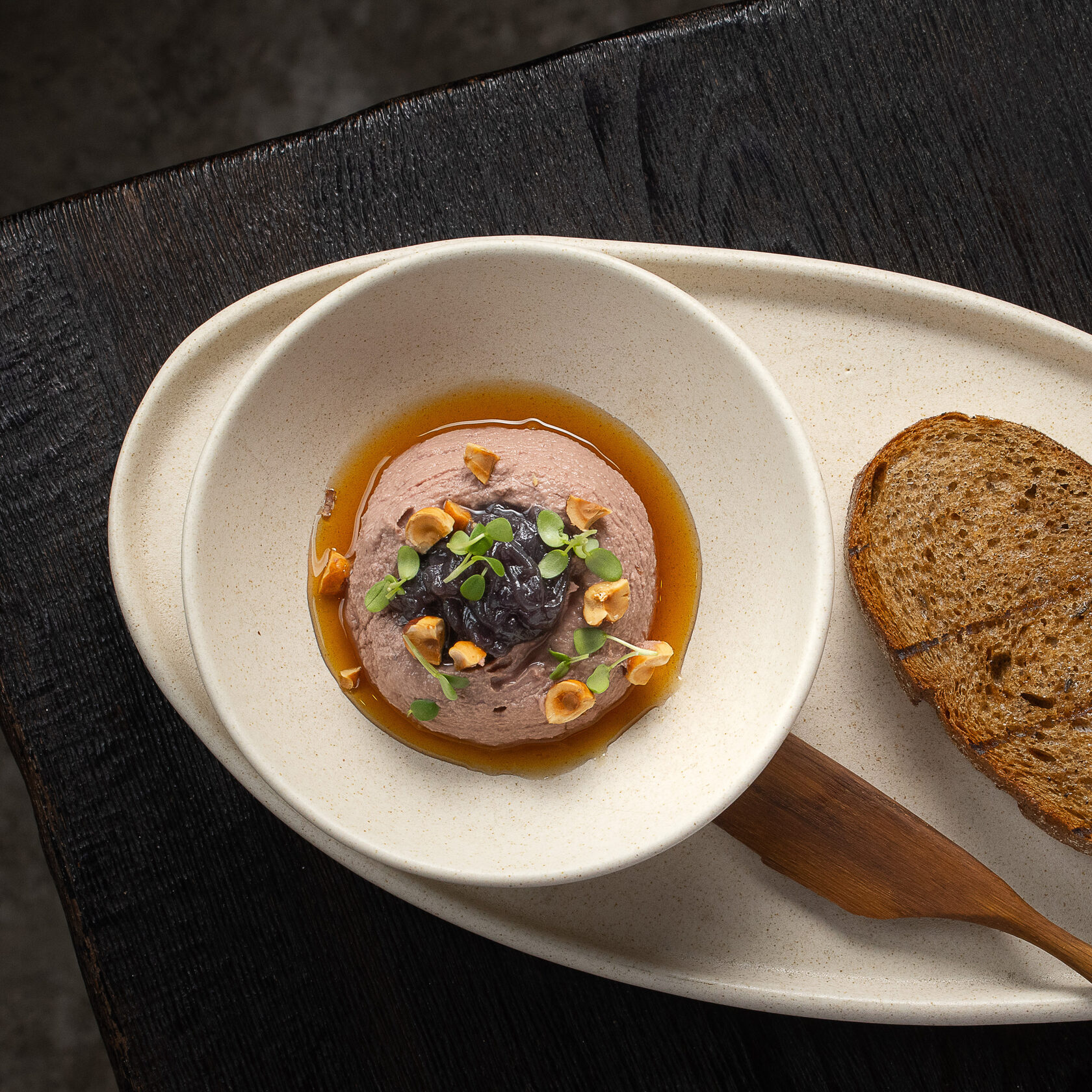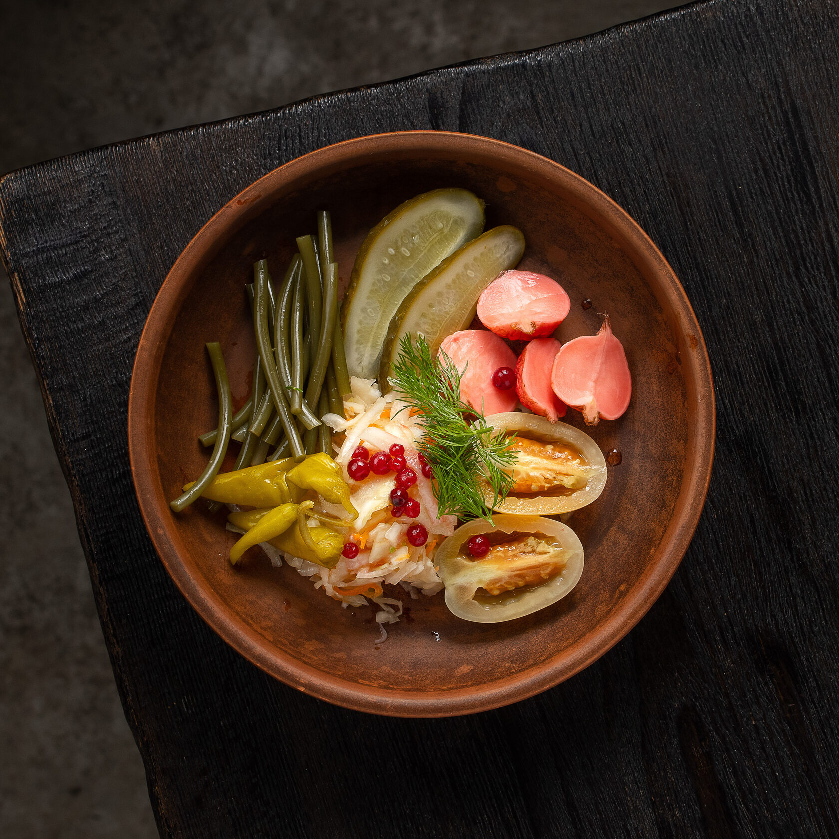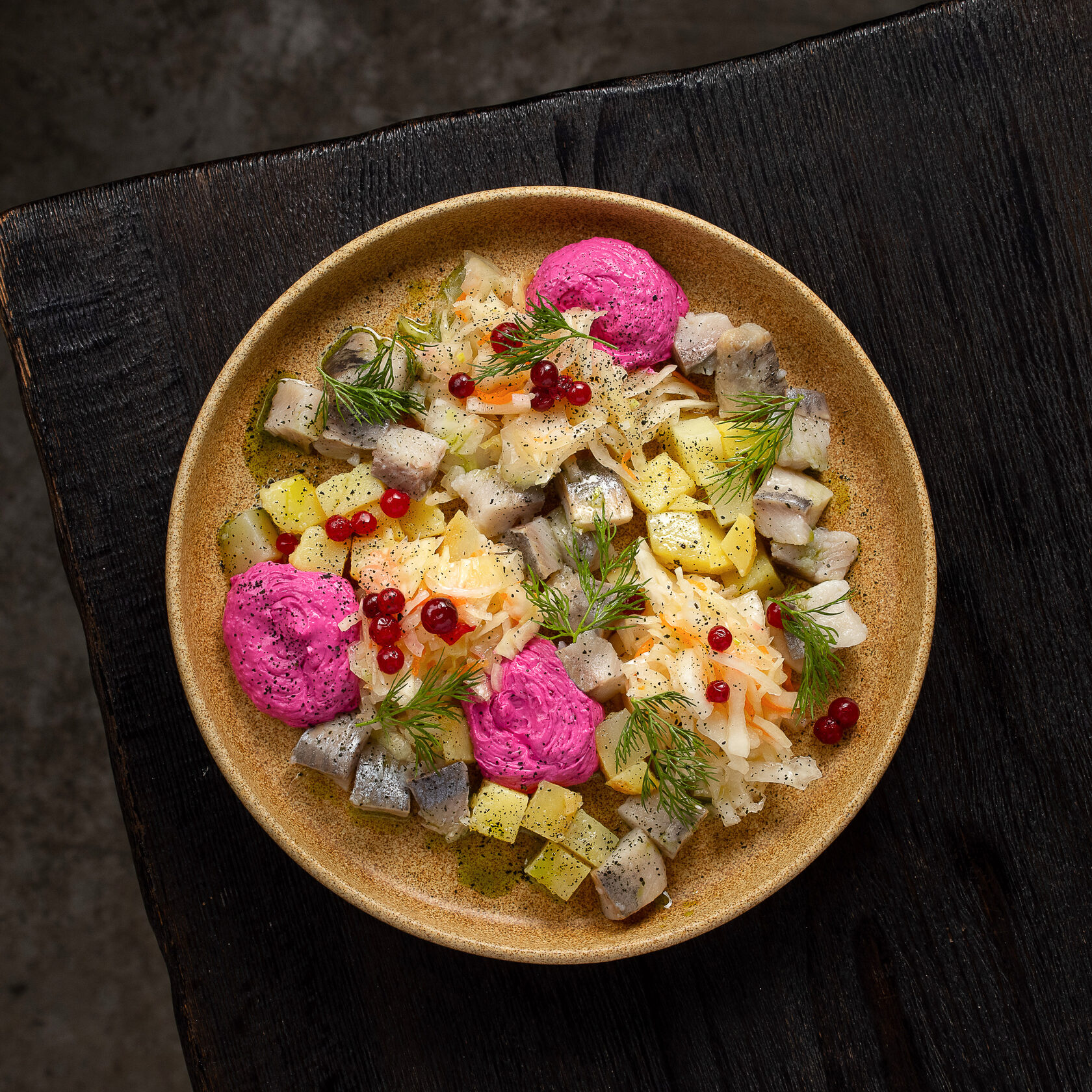 Рубленая сельдь с картофелем, квашеной капустой и свекольным кремом