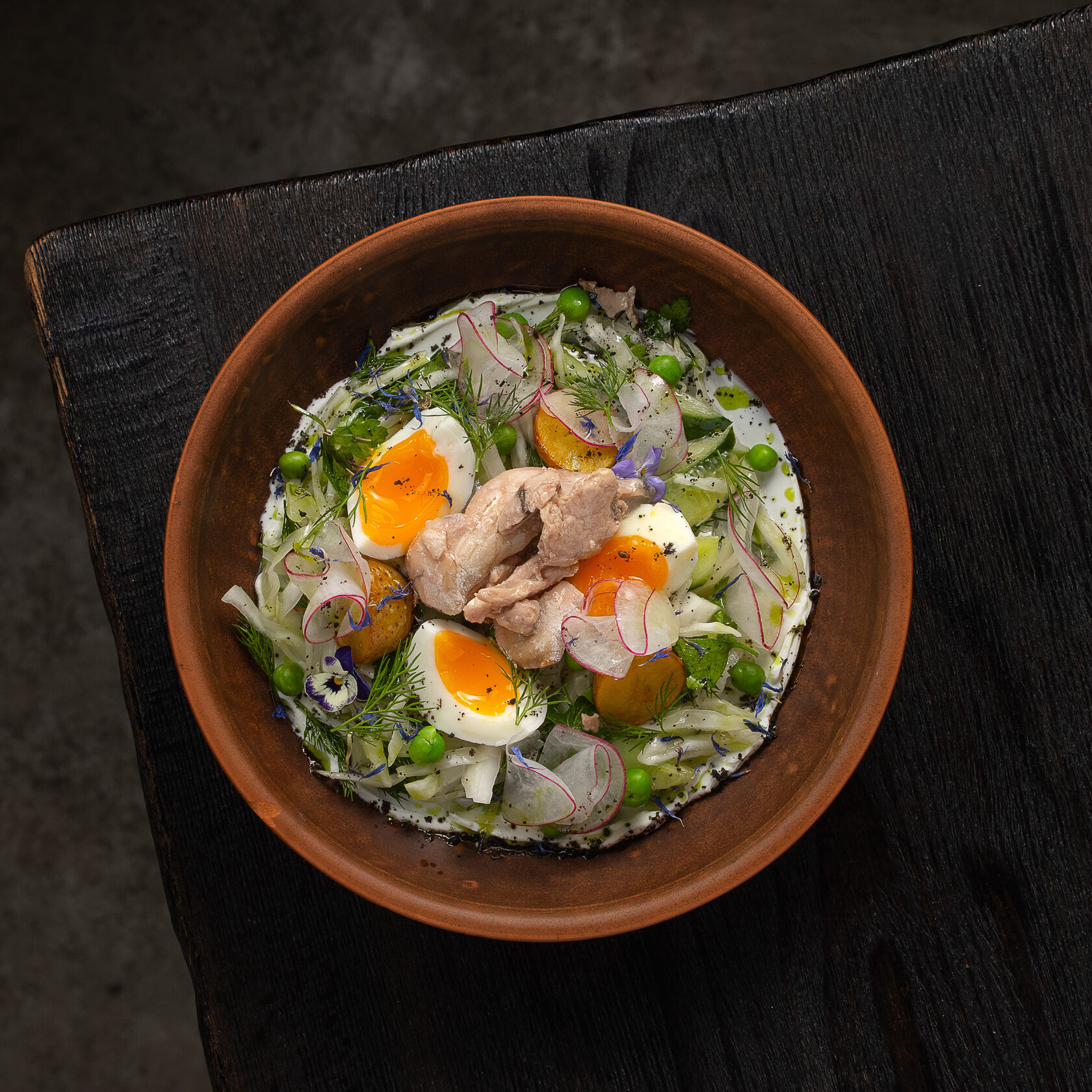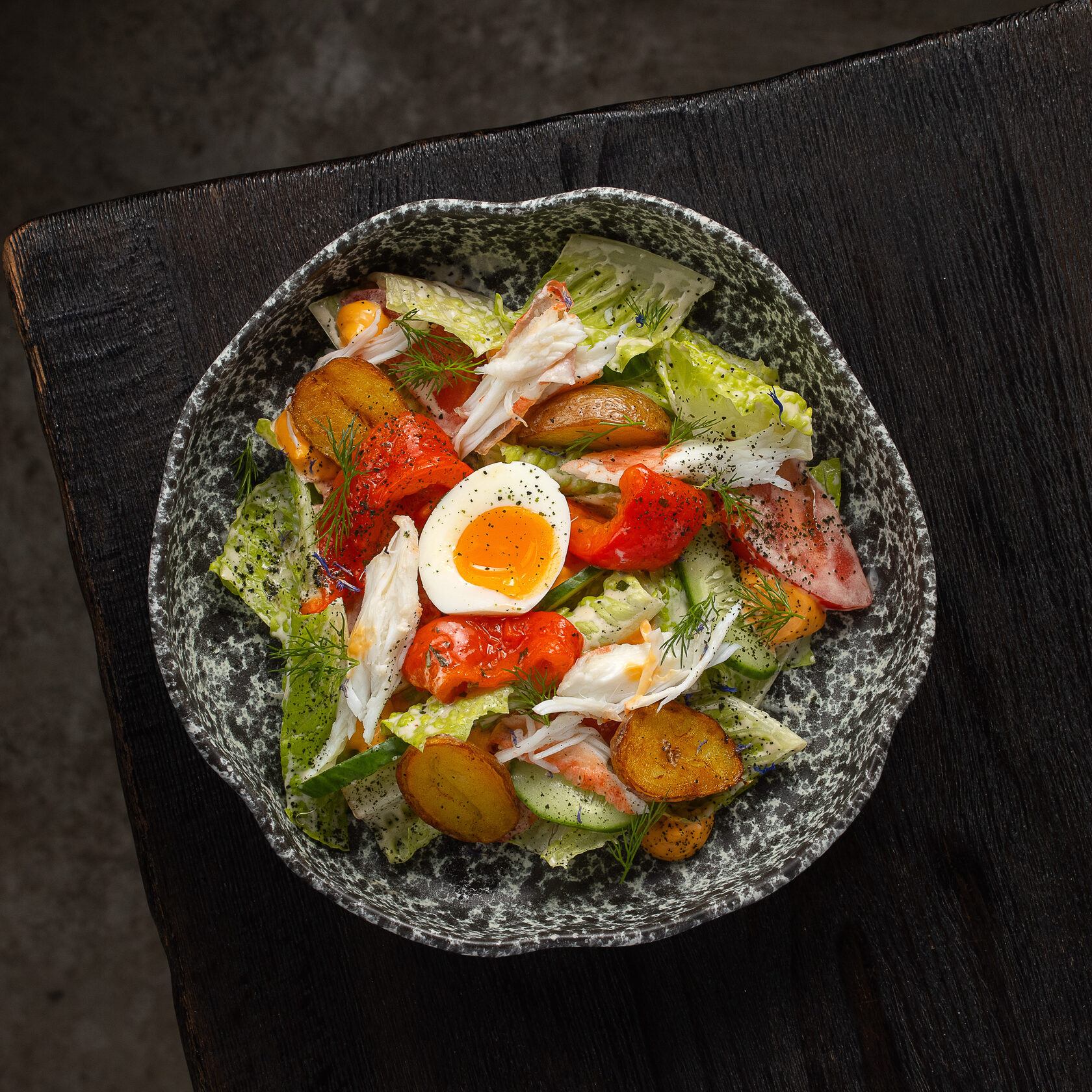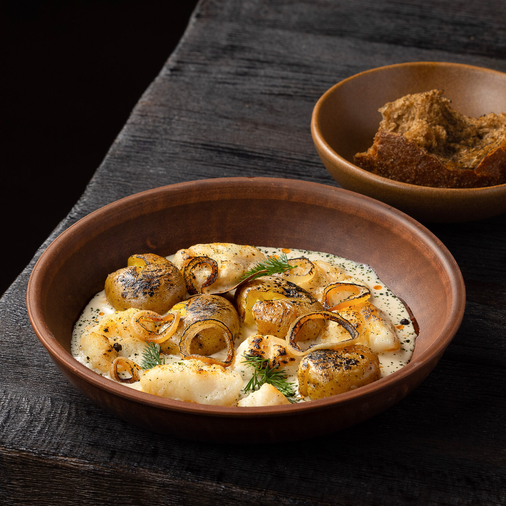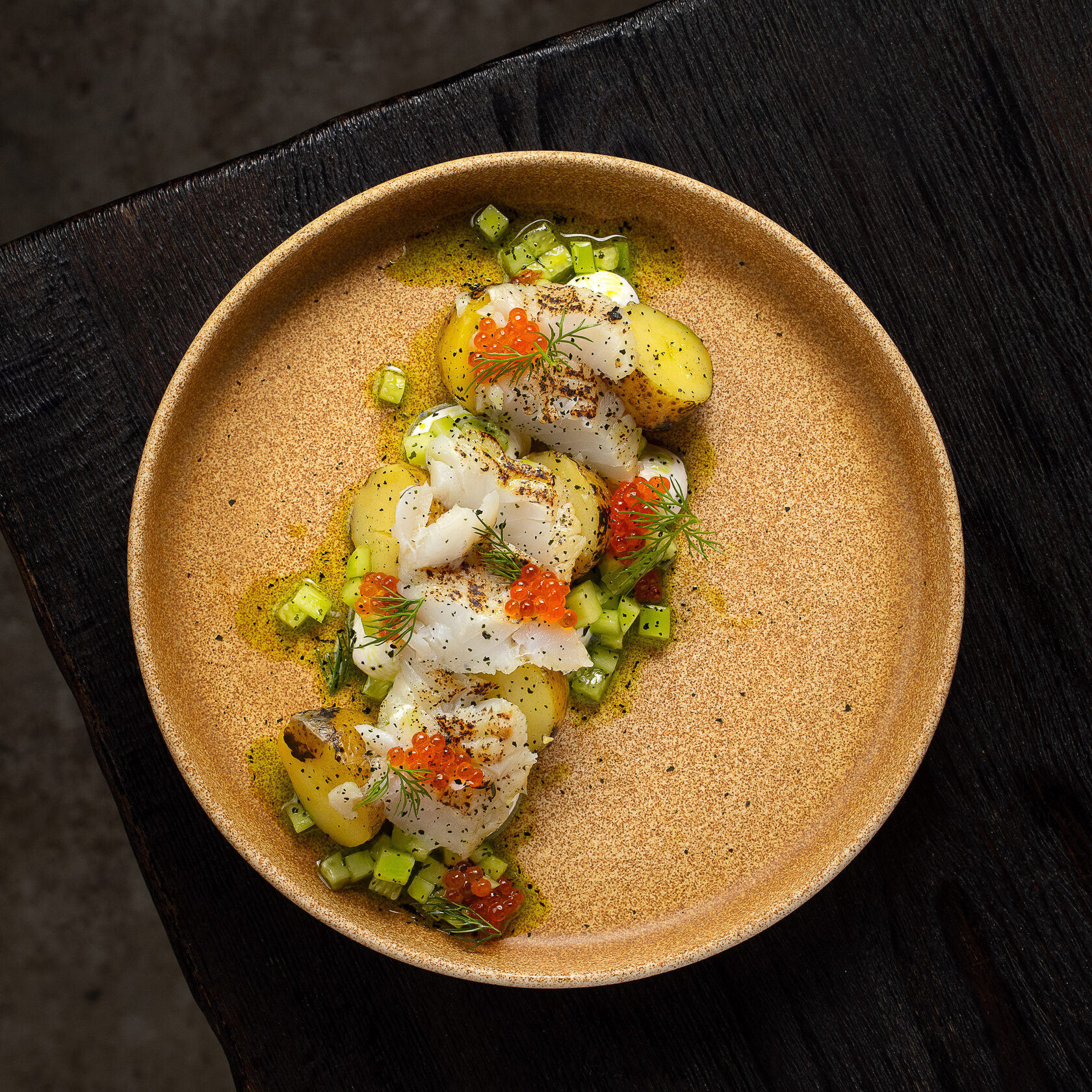 Обожжённая треска с картофелем, икрой, огурцом и сметаной