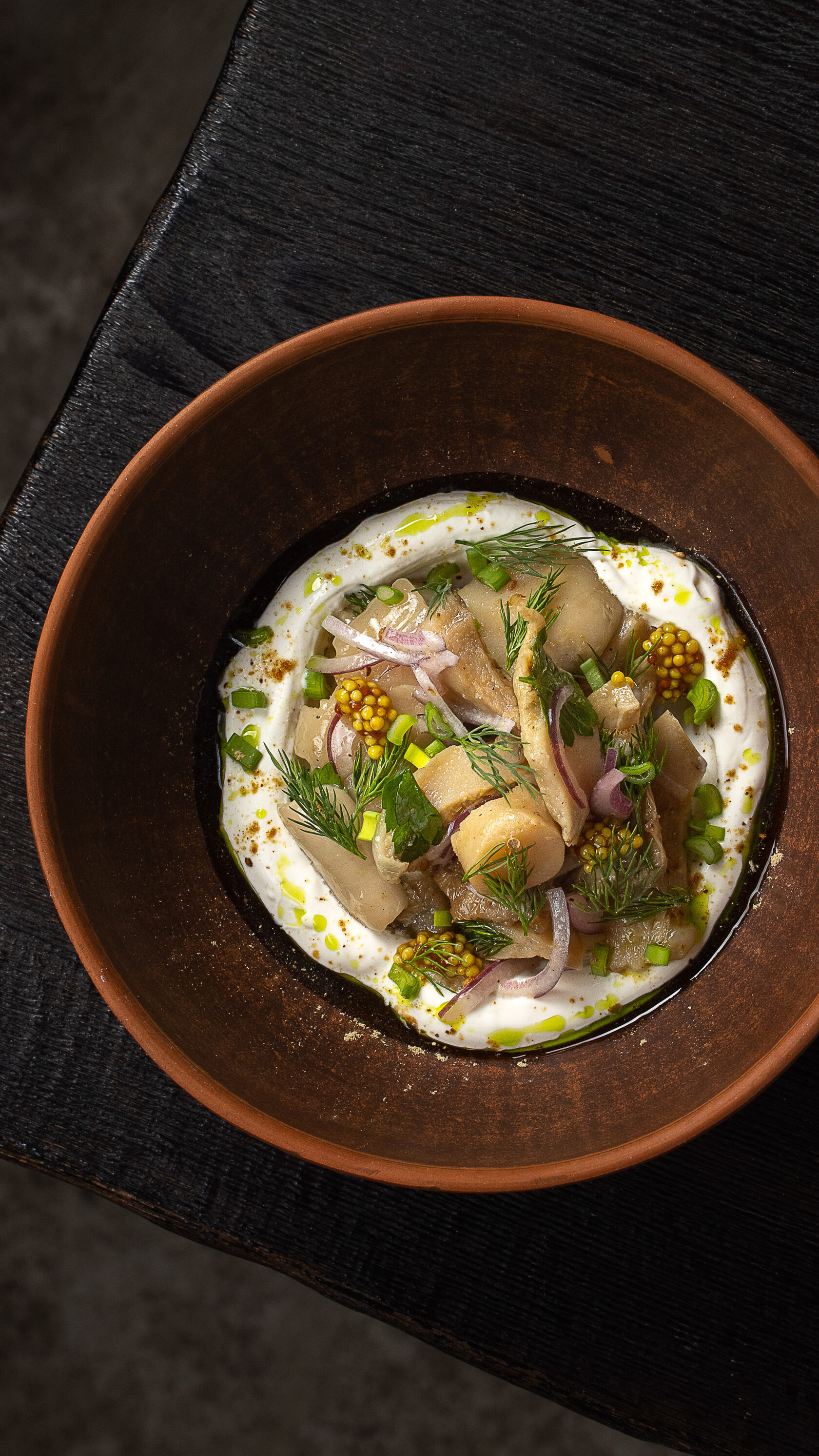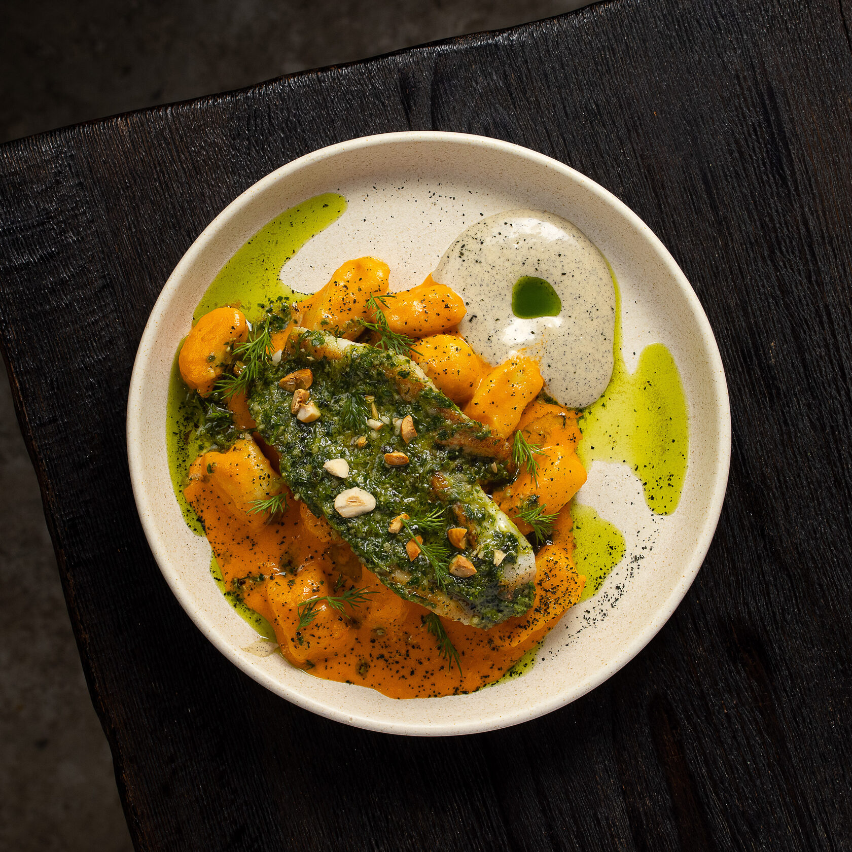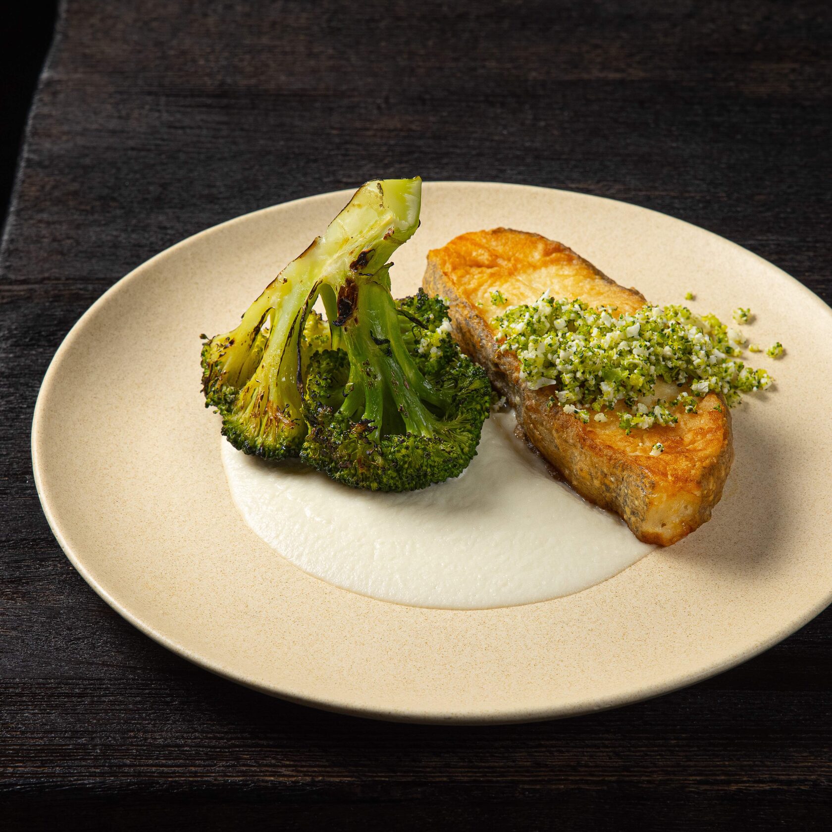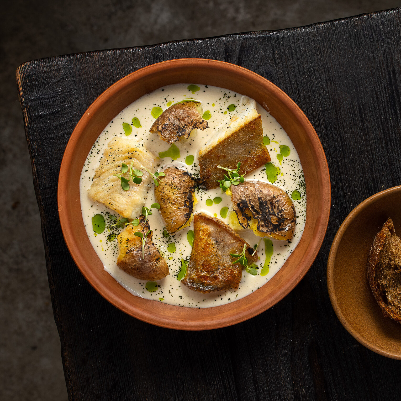 Обожжённая треска с картофелем, икрой, огурцом и сметаной