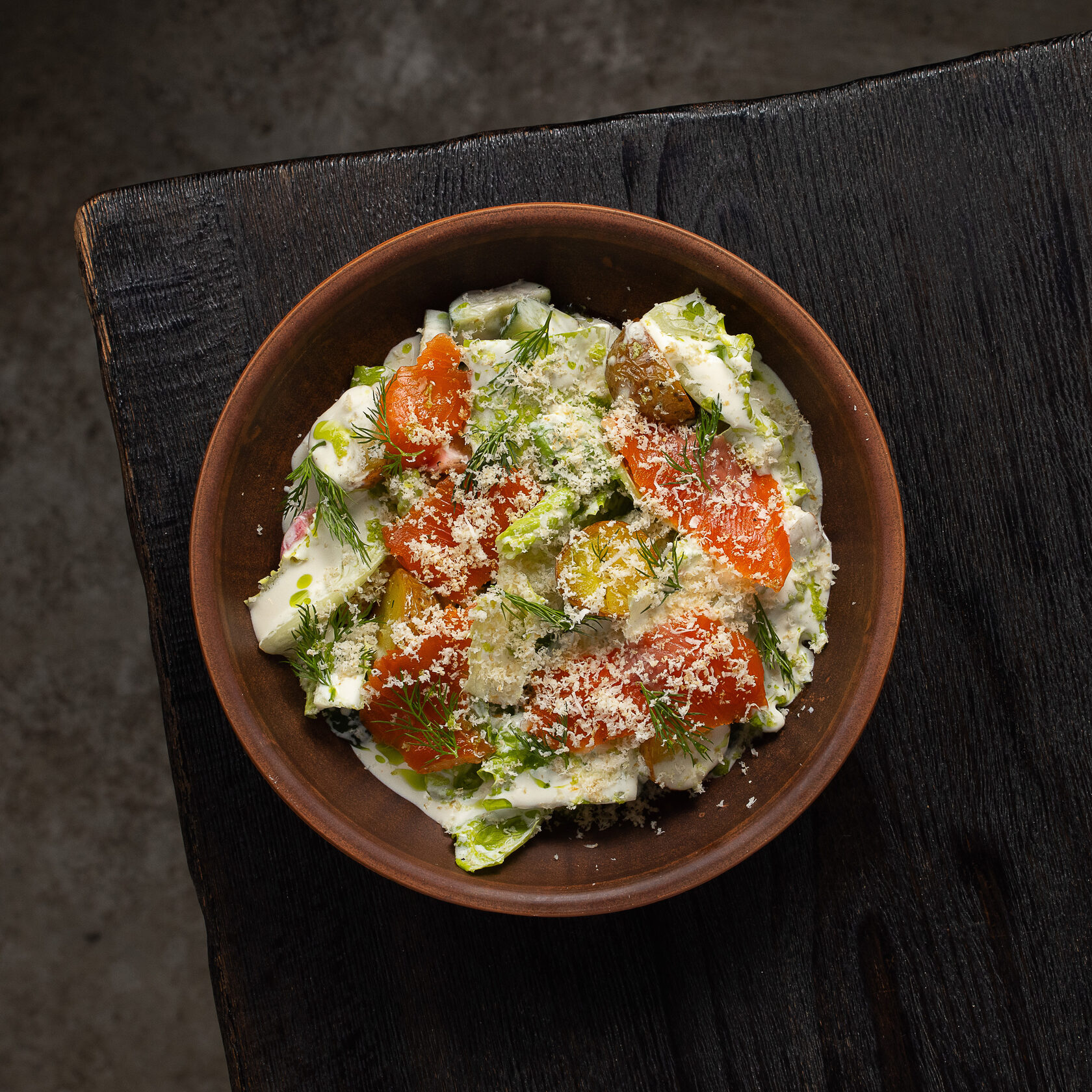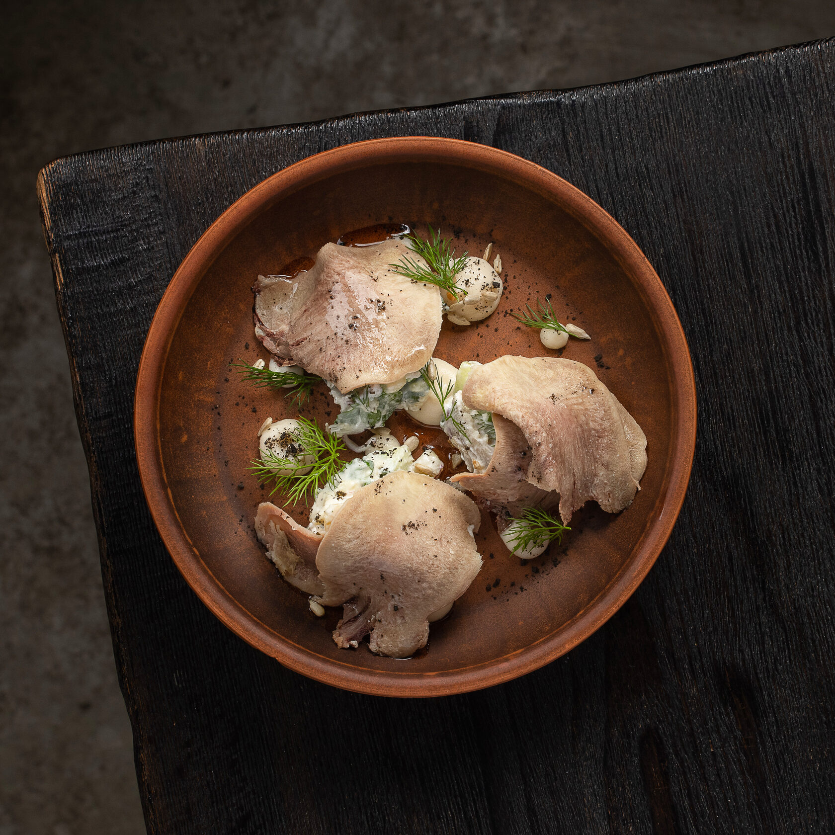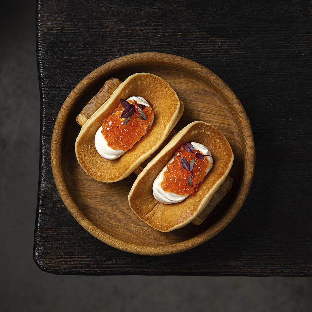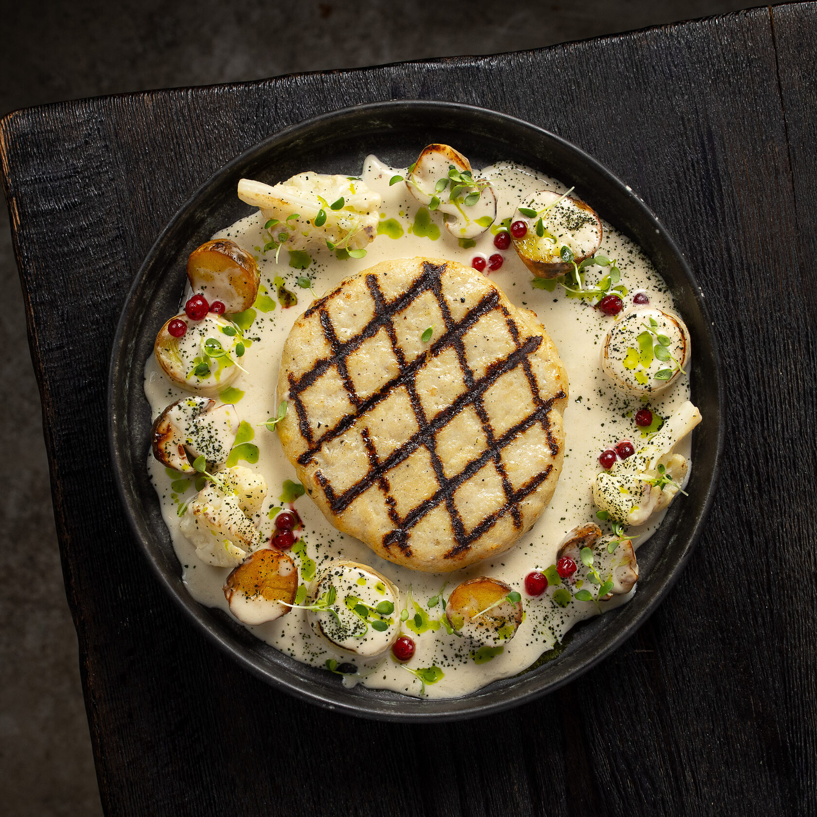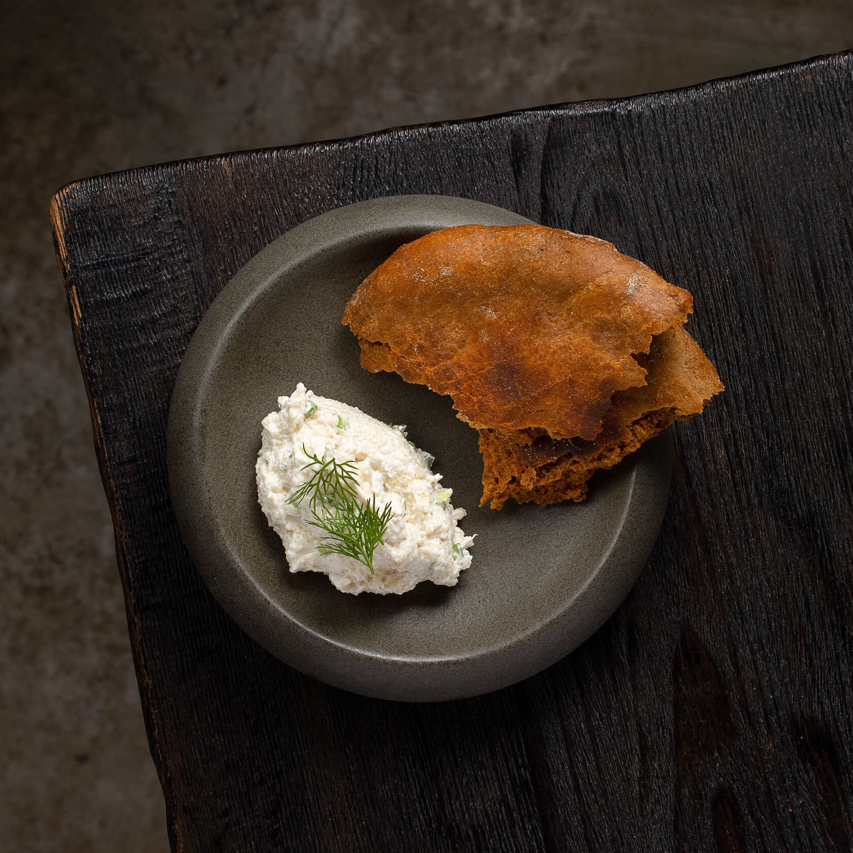 Обожжённая треска с картофелем, икрой, огурцом и сметаной