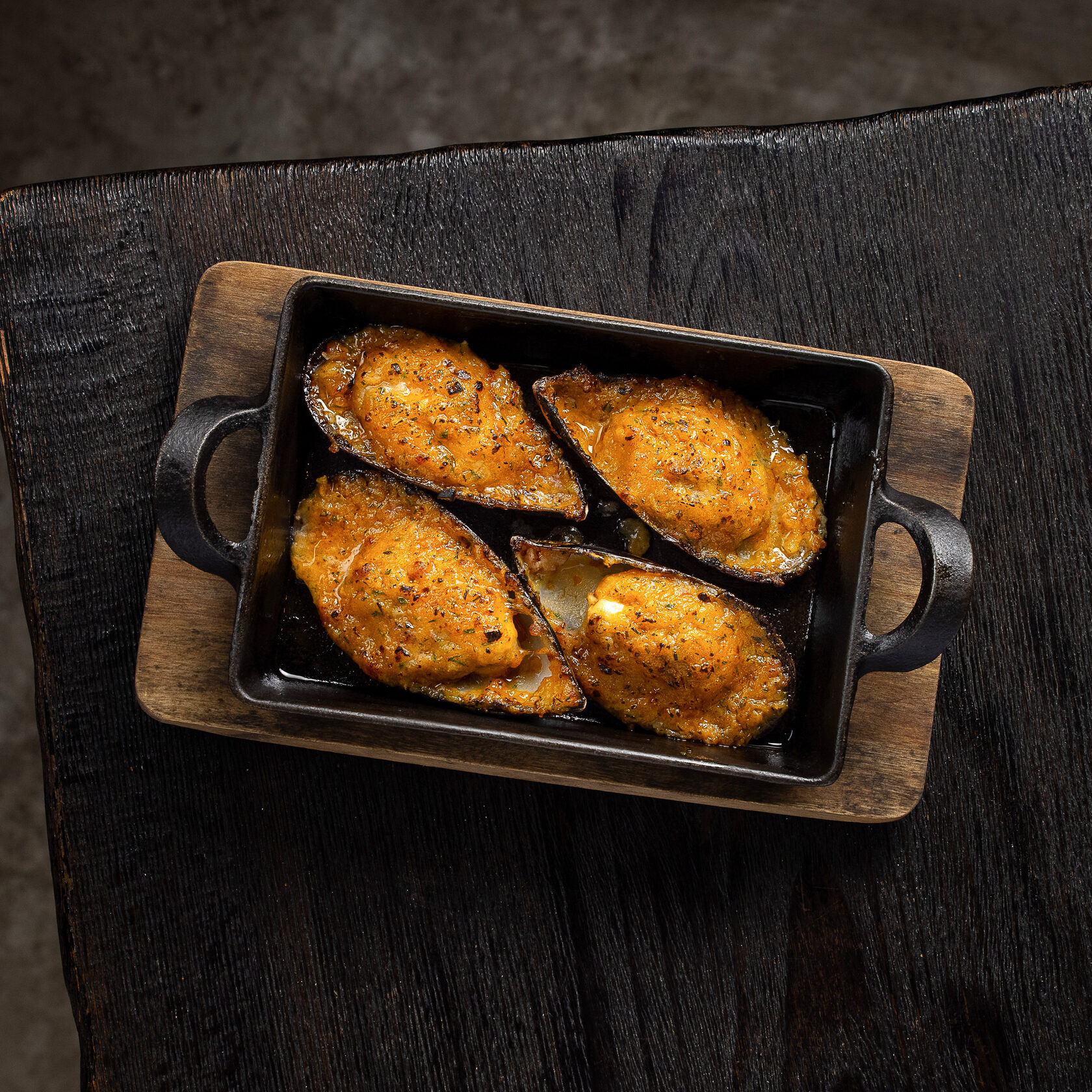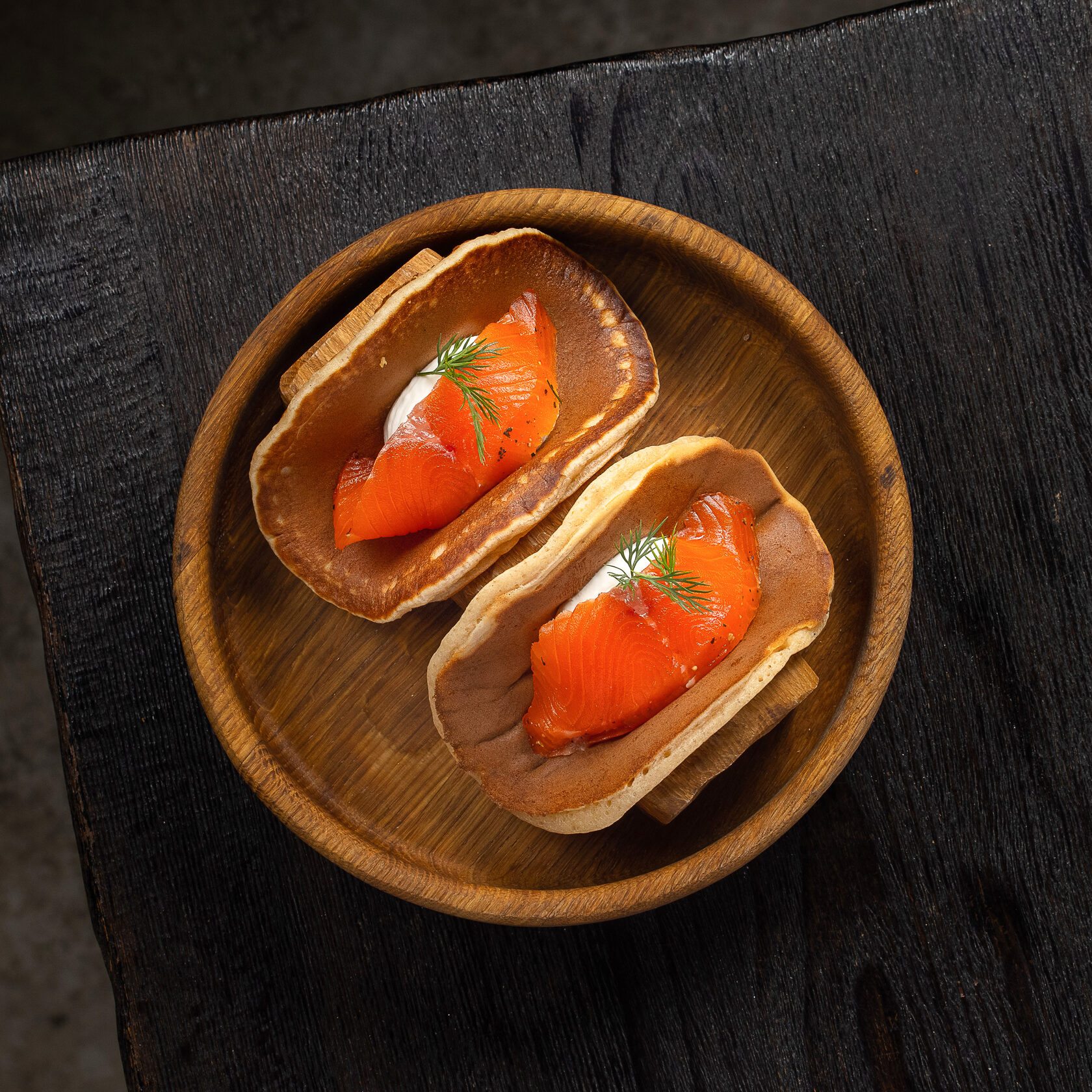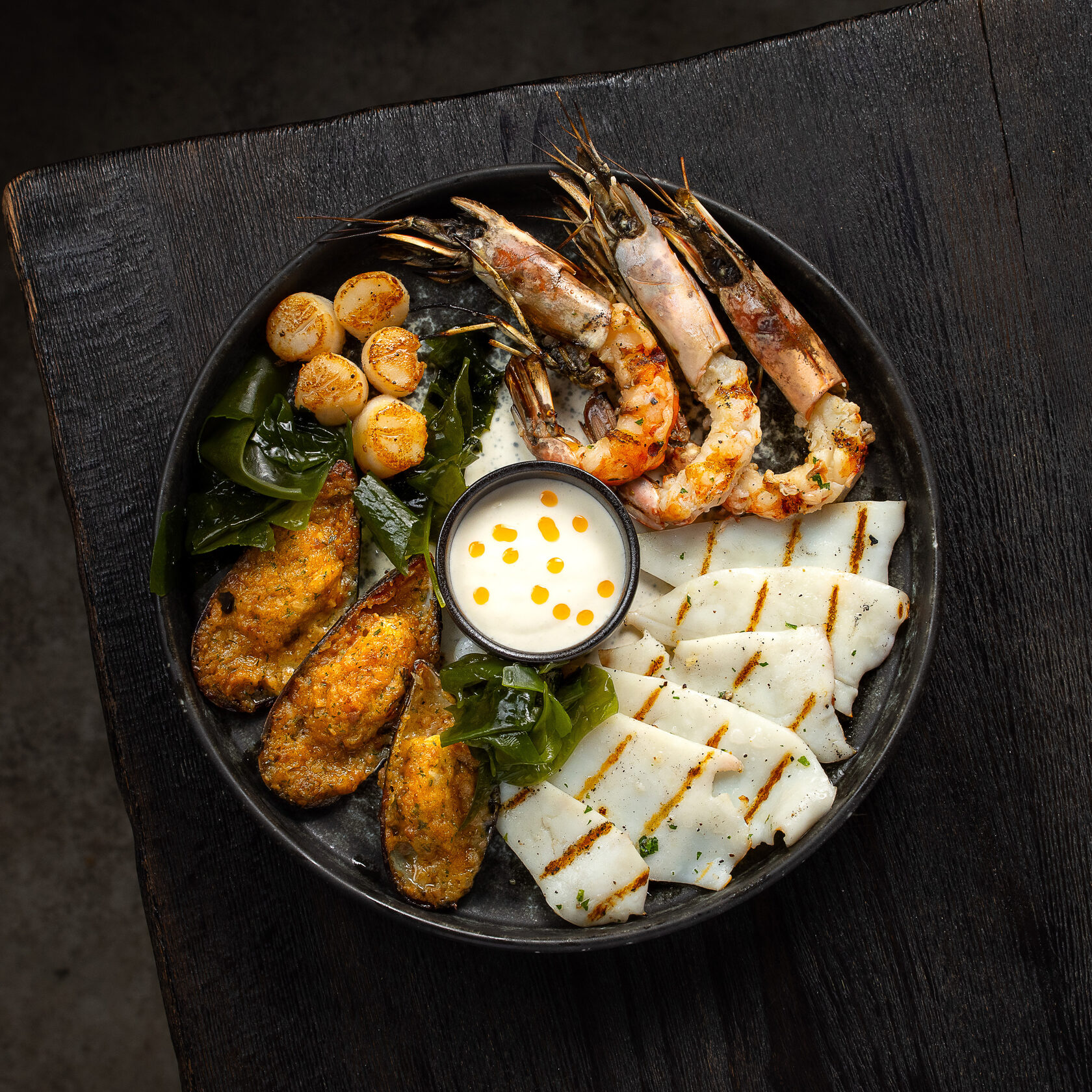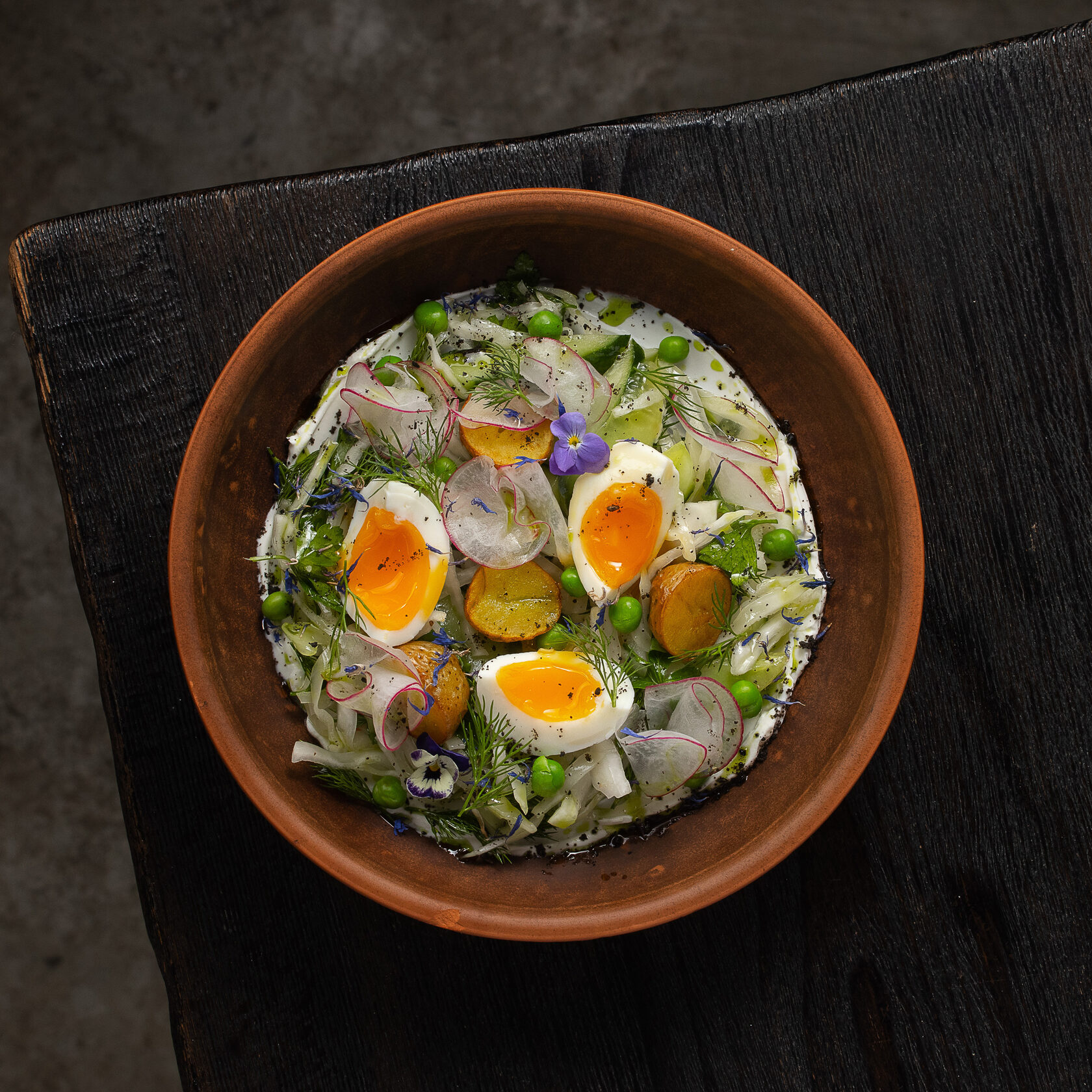 Обожжённая треска с картофелем, икрой, огурцом и сметаной